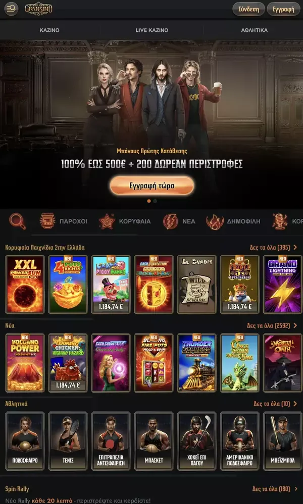 Όταν εγγραφείτε στο Gransino Casino, μπορείτε να επιλέξετε welcome offers για καζίνο και αθλητικά σε EUR. Για καζίνο, το πακέτο καλωσορίσματος είναι 100% έως 500 EUR συν 200 Free Spins με ελάχιστη κατάθεση 20 EUR. Το wagering είναι 35x (Κατάθεση + Μπόνους), και τα κέρδη από Free Spins έχουν wagering 40x. Για αθλητικά, η προσφορά καλωσορίσματος είναι 100% έως 100 EUR με ελάχιστη κατάθεση 20 EUR και wagering 6x (Κατάθεση + Μπόνους).